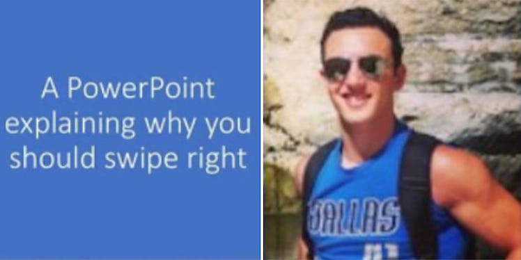 Max, 20, created a PowerPoint for his Tinder profile to ensure he got all the need-to-know, key incentives out about himself and his personality. The title of his presentation? "A PowerPoint Explaining Why You Should Swipe Right."