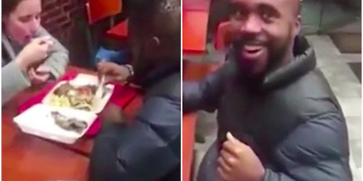 The clip, entitled "Interracial Couple Gets Harassed On Date," shows a black man and a white woman quietly sharing a meal at a restaurant, when a stranger suddenly begins making racial comments toward the couple.