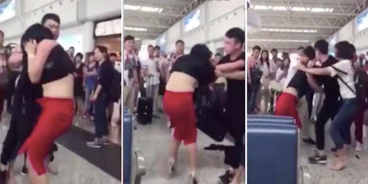 A Chinese wife and all-around bad bitch was less than pleased when she ran into her husband and his "mistress" at China's Wenzhou Longwan International Airport. While I would deal with this shock and disappointment by maybe spilling a drink on them if I was feeling particularly feisty, this angry wife did not hold back, like, at all.