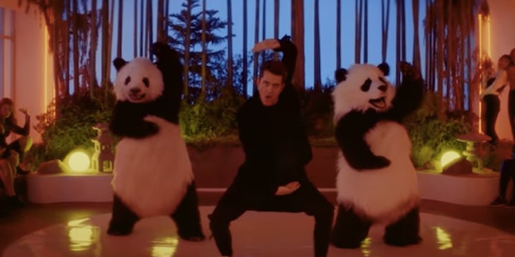He enters a room awash in red light meant to remind us of Tokyo's Red Light District, walks past a group of women dressed up in geisha robes and holding large fans, then sneers at an angry Asian mob boss and — in the video's most laughably who-approved-this moment — begins dancing with a pair of large pandas.