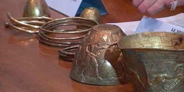 The "bongs," along with about seven pounds of other gold items, were discovered in Russia when holes were being dug up to install power lines. Criminologists were hired to decipher the black substance found inside these items.