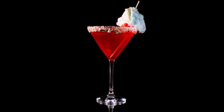 First, coat the rim of a martini glass with cotton candy-flavored Pop Rocks. Then, combine all the wet ingredients over ice in a mixer. Shake and strain the drink into your glass, and top everything off with your pretty pink pouf of cotton candy.