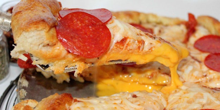 The cheese slices are placed directly on pizza dough, topped with more dough and then covered with sauce, mozzarella cheese and pepperoni. Here's the finished product.