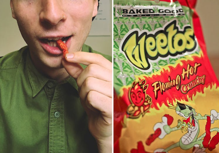 These guys taste just like traditional Flamin' Hot Cheetos, but with a hint of weed; delicious in the way that only something so terrible for you can be. The bag even resembles the Frito-Lay produced original, with the exception of a green (and presumably stoned AF) version of Chester the Cheetah belching flames.