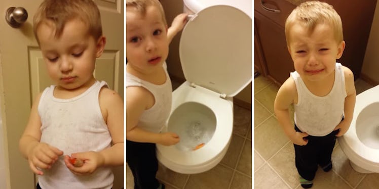 The kid in this video, however, does what he can to keep it together while paying respect to his goldfish in the only acceptable way -- throwing it in the toilet and watching it circle the drain in an incredibly transparent visual metaphor.