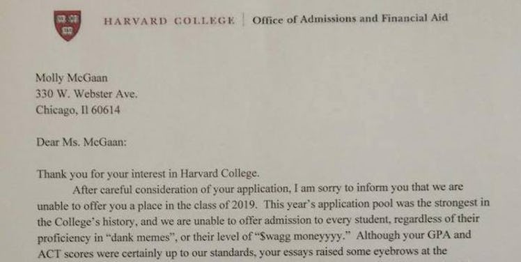 As much as I'd love to tell you that someone actually received this rejection letter after filling a college essay with everything the Internet loves, you don't have to be a Harvard student to figure out this might not be 100 percent authentic.