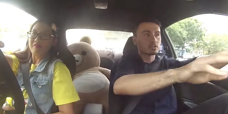 In a prank for the ages, professional racing champion Leona Chin disguised herself in an oversized pair of glasses and a denim vest before getting behind the wheel of the car.