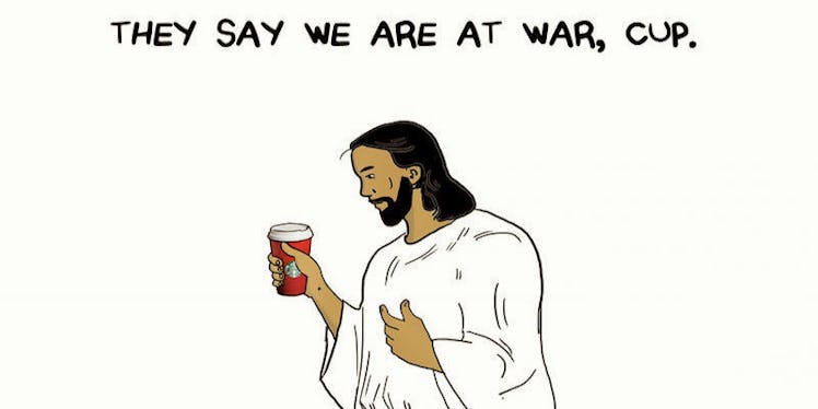 What, Jesus? You think it's weird millions of people freaked out because a coffee company didn't put snowflakes on its cups this year? What do you know? I bet you only drank tea, dork.