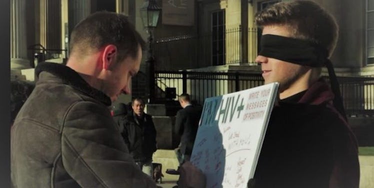 In the video, Hankers is blindfolded, standing in the very center of bustling Trafalgar Square in London, England, holding a board that reads, "I'm HIV-positive, write your messages of positivity."
