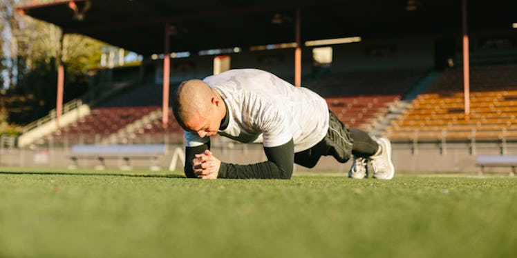 Balance on your toes and forearms, while creating a straight line with your body. Hold steady for a solid two minutes. Make sure your form is strong by not putting too much stress on your shoulders. And don't forget to pull in your abs — and to squeeze those butt cheeks like you're making diamonds!