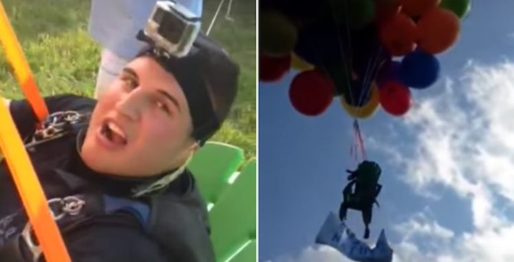 Guy Flies Himself Over Stadium In Chair Held Up By 120 Balloons In Insane Video