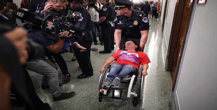 Just when you thought this whole health care situation couldn't get any worse – it got worse. On Sept. 25, protestors were forcibly kicked out of a Graham-Cassidy health care hearing. The kicker? Many of them were in wheelchairs. And the videos of Graham-Cassidy protesters in wheelchairs being dragged away by police are horrifying.