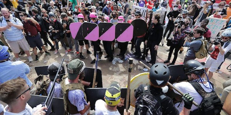 Several hundred people had gathered in Charlottesville, VA for a “Unite the Right” rally on Aug. 12, organized by right-wing leaders. It followed Friday night's march of alt-right demonstrators at the University of Virginia campus, where torch-carrying white nationalists surrounded counter-protesters around the base of a statue, yelling slurs and throwing torches. A video from a counter-protester on the ground seems to show the moment things went violent, as a alt-right demonstrator begins attacking counter protesters.