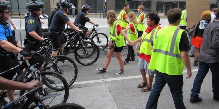 The first day of the Republican National Convention was in many ways defined by massive protests flanked by an extraordinarily large police presence.