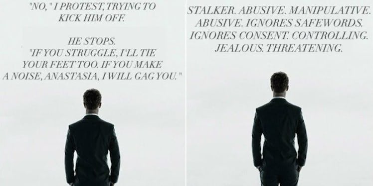 To prove that point, Tumblr user The Sixth Siren of Pandora found the most controlling, manipulative pieces of dialogue from E.L. James' erotic novels and Photoshopped the lines over the "Fifty Shades" movie posters.