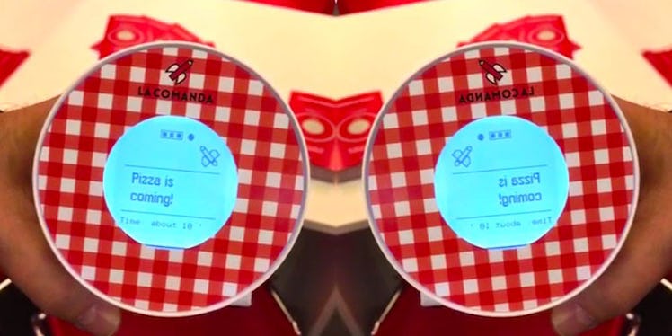 The front screen shows the wait time for your pizza's arrival, or it can display promotional offers and customizable options from the pizza vendors.