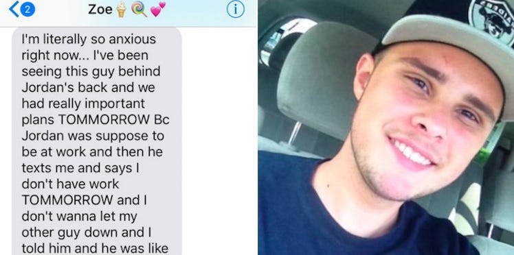 That's right: Jordan's girlfriend, Zoe, accidentally texted him an elaborate cheating scheme she was planning behind his back instead of her friend.