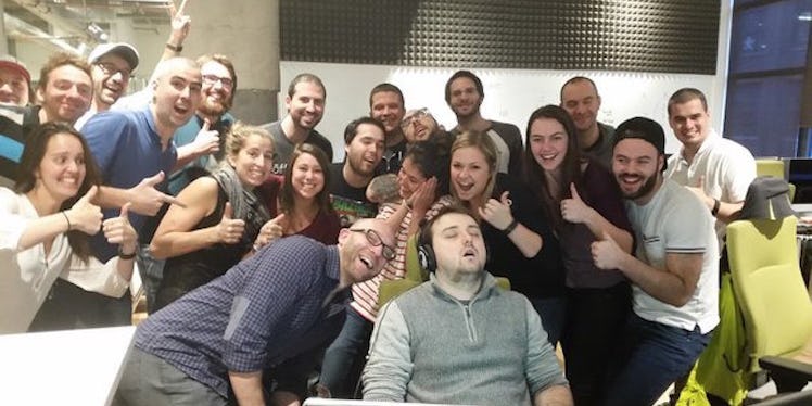 After falling asleep on the first day of his internship at a tech startup, other employees noticed and gathered around Reddit user "TheOrangeDuke" for a quick photo op.