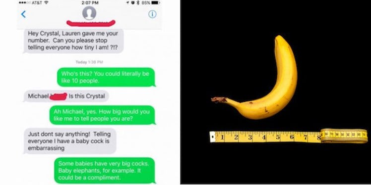 He reached out to a woman who he believed to be someone named Crystal because she's apparently been going around town spreading rumors about his small penis.