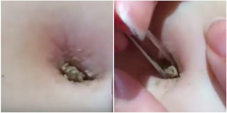 He dug deep and finally pulled free the vile object that had been lying in her belly button for a sick number of months.