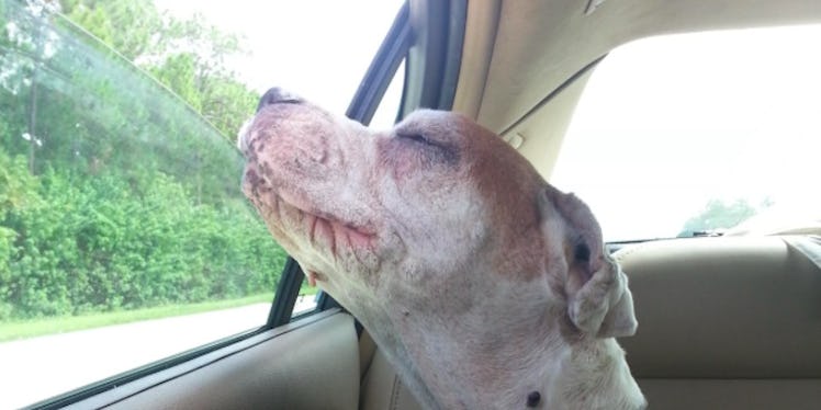 The dog's age shows in his wrinkled skin, sparse coat and grey hair. With a wide smile and closed eyes, he's taking in the fresh air one last time.