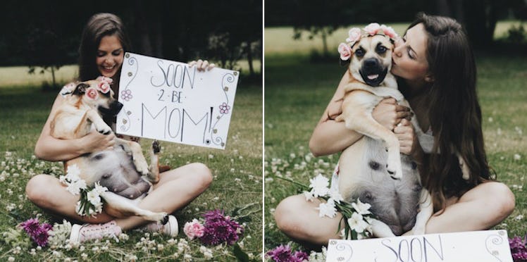 In the photos, Fusee, a pug mix, sports a dainty rose flower crown as she poses for the camera alongside her BFF, Elsa, who holds a sign that reads, "Soon 2 Be Mom." She smooches her dog's furry cheek and looks super proud of the pregnant pup.