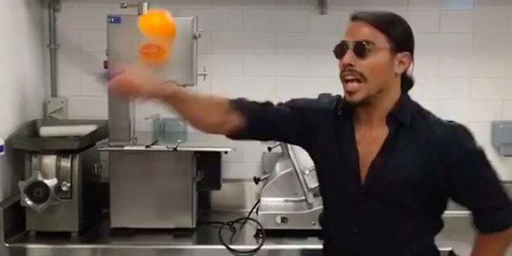 Take a look at Salt Bae in action and try not to swoon too much over his fruit-slicing muscles.
