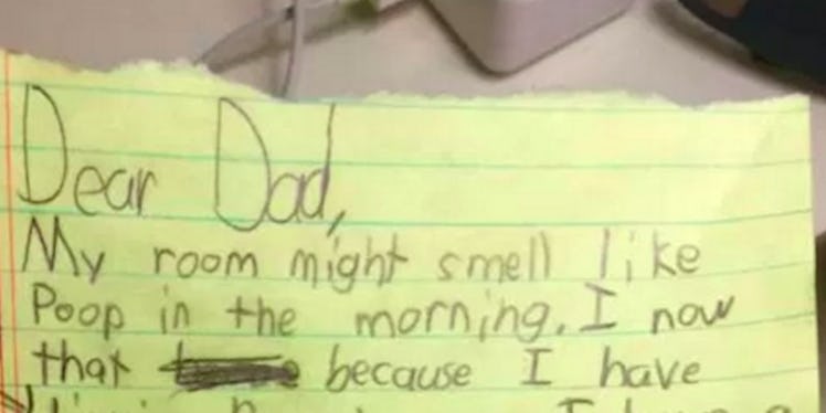Dear Dad, My room might smell like poop in the morning. I now that because I have diaria. Do not worry I have a towel just in case. [tick box] [smily face] [towel emoji]