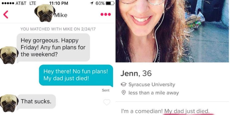 Let me say, it's really sad Jenn's dad died, but her macabre Tinder account is very, very funny and also highlights how little empathy men have.