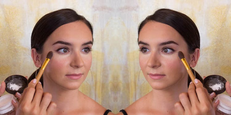 Using a quick hand and a little speed, use the powder brush to sweep the excess powder off your face and away from your nose. If you're heading in front of the camera, leave the look as is. But if you're angling for something a bit more natural, make small circles with the brush to blend in any residual loose powder.