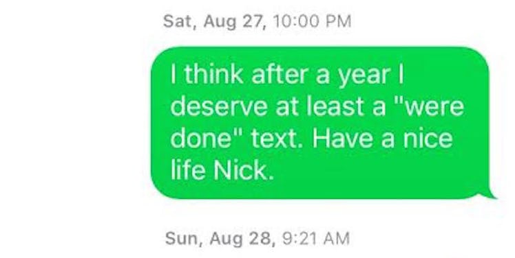 Nick and I met through work. We started seeing each other, hanging out multiple times a week, texting or calling all day. We went through some struggles, but all was well. We weren't super serious, but he got me a necklace for Christmas that said, "I love you to the moon and back" (LOL). He got a new apartment with no more roommates in May, about nine months in, and something changed. We would make plans to hang out, and then, he would have an excuse. He would not answer my texts or calls, but magically be on Facebook. I could tell that he was just not into me anymore (even though he kept assuring me he was), and yet, for some reason, he agreed to be my plus one at a wedding one year after we began seeing each other. At this wedding, he was introduced to all my co-workers, friends and customers. A lot of these people meant something to me, and it was a big deal for him to be there. After the wedding was the conversations you can see in these screen shots:
