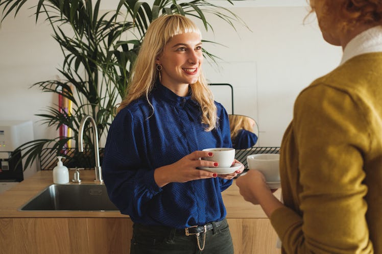 Goren adds that you should def ask your coworker out in a "comfortable place, that does not put either of you in a position of power." For example, asking your assistant or team member's assistant out for coffee in the kitchen or the common area is better vibe than say in your office, with the door shut. "Make sure that person feels as though they are an equal," Goren says. "They should not feel intimidated and therefore obligated to accept."