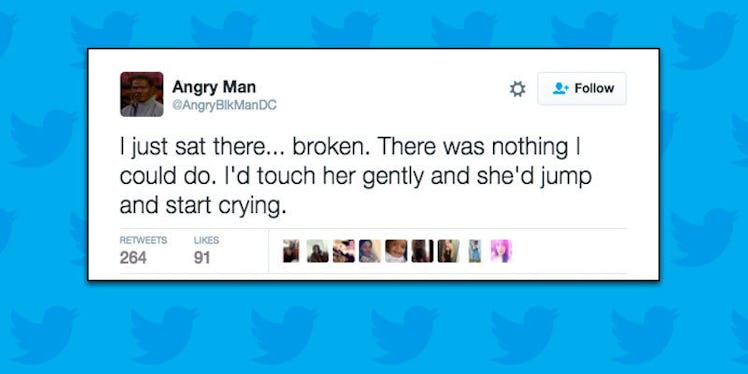 I just sat there... broken. There was nothing I could do. I'd touch her gently and she'd jump and start crying. — Angry Man (@AngryBlkManDC) August 16, 2016
