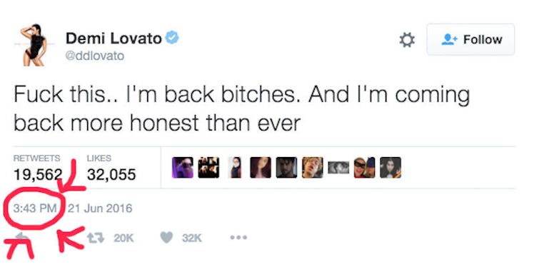 Well, now it's Tuesday and it appears she's made a full 180. Literally 24 hours after Demi Lovato bid farewell to Twitter, she's back and raring to go. She's a new person with even more to say! And she's coming back "more honest than ever."