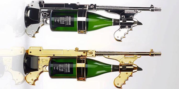 Created by the French company Extra-Night, the champagne gun features a 5-pound metal gun-shaped structure, which comes in a gold, chrome or rose gold finish, and fits any magnum-sized bottle of champagne.