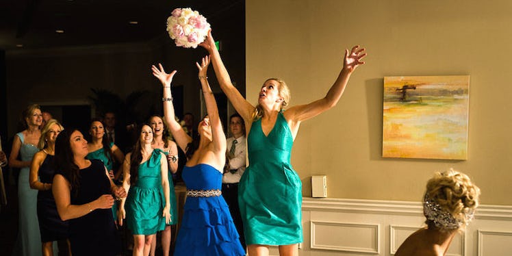 However, if we're ranking wedding rituals by the sheer amount of adrenaline involved, it's hard to top the bouquet toss, the magical moment when the most recently married woman in the room tosses a bunch of flowers in the general direction of a group of single girls hoping to follow suit.