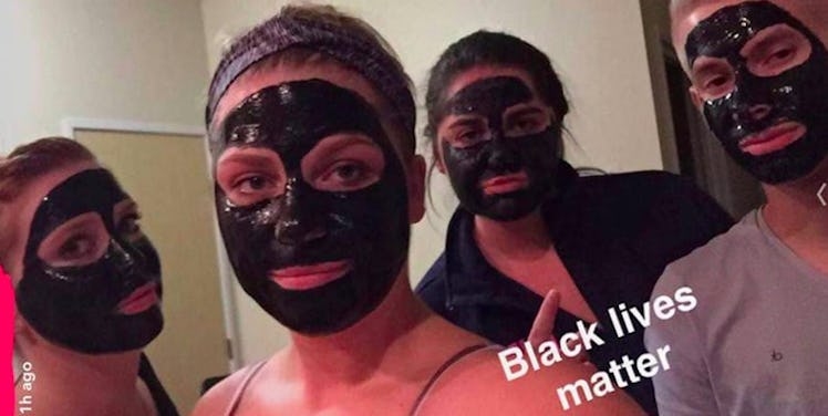 In the racist photo posted to Snapchat, three girls and one boy look blankly into the camera. Each one's face is covered in a black face mask, and the sarcastic "Black lives matter" caption is on the bottom right hand side.
