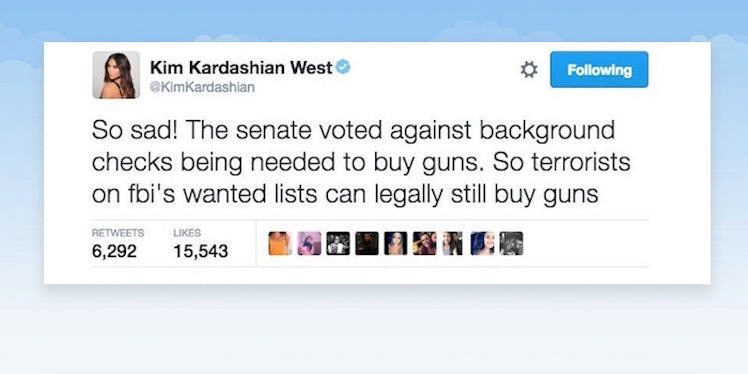 Kim Kardashian West joined this chorus of outrage, slamming the Senate for its refusal to do anything about gun violence in the US. She described it as "scary" how easily people in this country can obtain firearms.