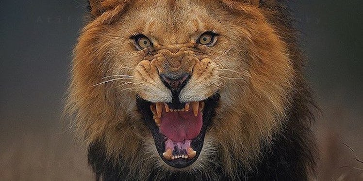 Shot by wildlife photographer Atif Saeed, the photograph features a large male lion mid-roar -- seconds before it lunged at said photographer in a very close attempted attack.