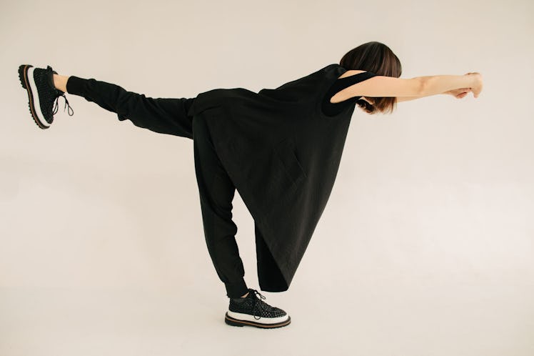 All you have to do, Seki explains, is start by standing with your feet together, than step one leg "all the way back, and bend both knees until your front knee is bent at a 90 degree angle and your back knee is a few inches from the ground." Step forward, repeat on the opposite side, and, if you're feeling fancy, add some dumbbells or a barbell for a challenge.