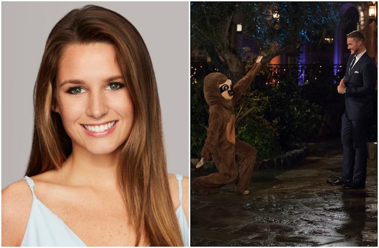 In the past, Night One at Bachelor Mansion has brought us unicorn heads, cupcake cars, and dolphins disguised as sharks. Season 23 of The Bachelor was no different, introducing a contestant dressed as a sloth and reminding Colton Underwood that she understands he likes to take things slooowly. She may have inspired countless tweets on premiere night, but Alex D.'s sloth costume on The Bachelor actually had a well-meaning intention.