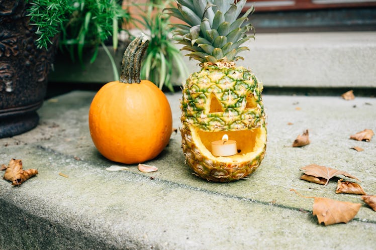 Spongebob isn't the only one who's keen on styling a pineapple. This trendy jack-o-lantern option provides a Hawaiian take on Halloween, and your costume party might be mistaken for a luau. Carving a pineapple is similar to carving a pumpkin: remove the stem, get rid of the guts inside (the way your favorite horror villain would), remove unwanted excess, and get ready to carve a funky face. It's time to make Bikini Bottom proud.
