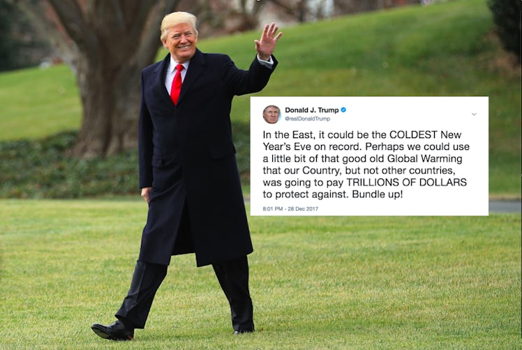 During his holiday vacation at Mar-a-Lago, President Donald Trump took time from his getaway to moonlight as a meteorologist, and his commentary had Twitter in an uproar. On Thursday night, Dec. 28, Trump tweeted about "good old global warming," sarcastically bringing up the ice cold temperatures up and down the east coast ahead of the New Year, and suggesting once again that climate change is a hoax. The president wrote, "In the East, it could be the COLDEST New Year’s Eve on record. Perhaps we could use a little bit of that good old Global Warming that our Country, but not other countries, was going to pay TRILLIONS OF DOLLARS to protect against. Bundle up!"