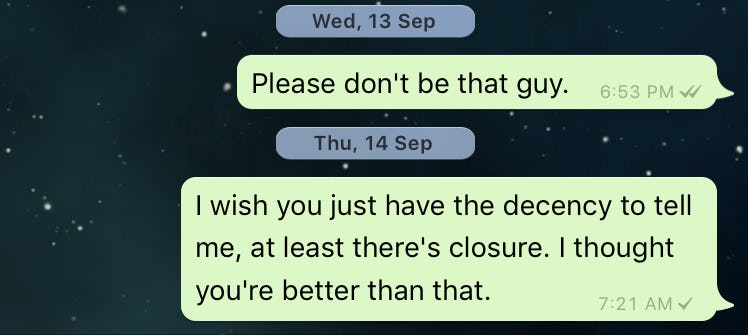 Hmm, this guy literally told her to "stop worrying so much." Why would she be so worried? Why could she possibly be so worried? Oh, I know. Maybe she's worried because some jerk still managed to ghost her even after specifically telling her to stop worry so much?!