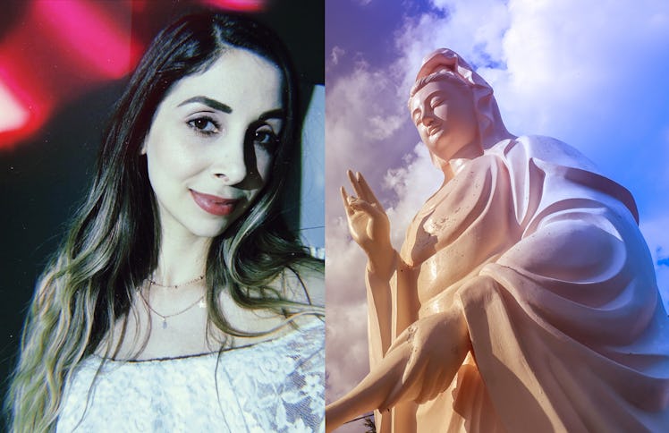 She had us sit upright with both of our feet on the floor and our palms facing upward on our thighs. With the help of Kuan Yin, Allan guided us through the meditation. She explained that Kuan Yin was activating each of our chakras, powering it with heavenly light, and showing us the infinite universes we are capable of reaching. Kuan Yin then placed stones on our feet to ground us, keeping us firmly rooted in the earth. Finally, Allan repeated: "Kuan Yin, please open our psychic abilities," and the image of this Buddhist goddess opening a white door came over me.