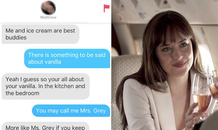 You can't deny that the writing — both in E.L. James' books and the respective film adaptations — practically begs to be used to pick up unsuspecting men. Here's what happened when I messaged my Tinder matches only using lines from Fifty Shades. My only regret is that I couldn't find a way to work in the "boobs in boob-land" bit. I guess there's always next time.