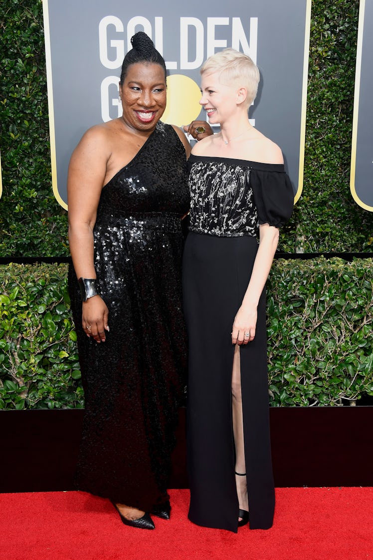 Burke hit the red carpet with her date Michelle Williams, who is nominated for Best Actress in a Drama, and who is one of the eight Hollywood actresses who opted to bring activists along as their guests in order to take a stand against sexual harassment and gender inequality.