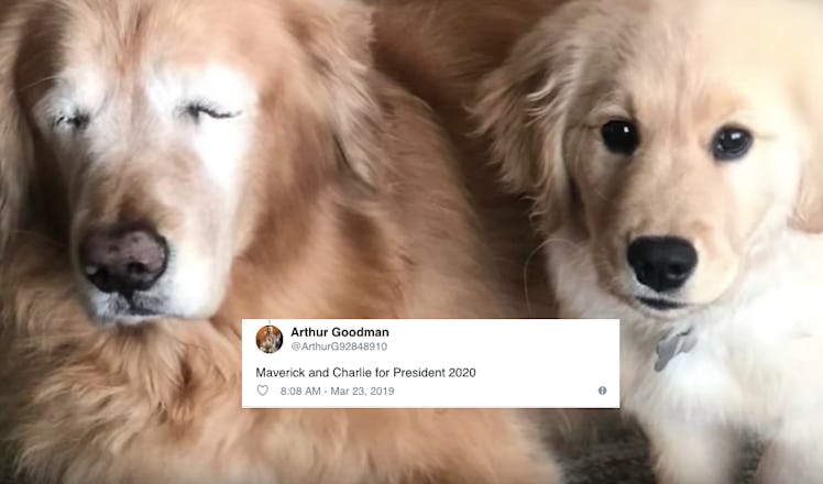 Charlie is an 11-year-old golden retriever from North Carolina who belongs to Adam and Chelsea Stipe, according to People. About three years back in 2016, Charlie had to get his left eye removed due to glaucoma, and a year later, he had to get his right eye removed as well. Charlie is no longer able to see, which initially was quite difficult for him. But earlier this year in January, the Stipes decided to bring home 4-month-old Maverick. And although the pups didn't originally bond, Charlie now relies on Maverick for everything — to get him around, play, eat, and even sleep. It is seriously way too cute, and as you could probably imagine, Twitter is going wild. Check out their responses, below.