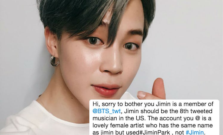 That Jimin (@jiminpark07) is actually somebody else — fellow K-pop soloist Jimin Park, who is represented by JYP Entertainment. While Jimin Park is undoubtedly talented and beloved by her fans, ARMY couldn't help pointing out that, based on the fact that BTS was Twitter's overall most-tweeted-about musician and has 17 million followers (compared to Jimin Park's 500K+), Twitter must have made a mistake. Fans were understandably confused, and they told Twitter as much: