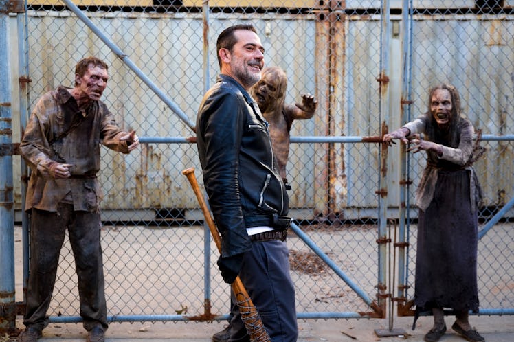 Towards the end of the episode, we saw Negan appear to figure out a new way to attack the Hilltop and the Alexandrians. He (very graphically) pulled off some zombie flesh from one of the "walkers" that he had chained on the fence of the Saviors' compound, and smeared his favorite weapon, the barbed-wire baseball bat Lucille, around in the gore. He told his fellow Saviors that he has a new idea in his plan to attack Rick and his crew. "No more smashing and bashing with this," he explained to the Saviors, gesturing with Lucille. "With this it can just be a touch, or a big wet kiss. Either way, this gets you you full membership and that's what we want. We want people to join the club!" That club, we can assume, being Club Zombie. He finished, "Hilltop is gonna learn to toe the line one way or another, whether it's dead or alive."